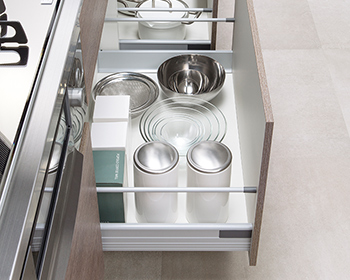 大き目の鍋などもすっぽり入る大容量の引出しは、手前までスムーズに引き出せて奥のものまで見渡すことができます。