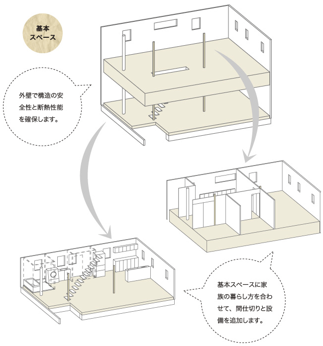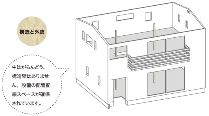 「特徴」でもご紹介しましたが、木造ドミノ住宅は、スケルトン・インフィルを採用しています。