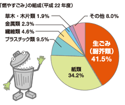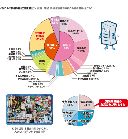 平成22年の京都市の可燃ごみの排出量は497,130トンで、一日一人当たり約924gでした。そのうちの41%が生ごみでした。約380gです。年間にすると約140kgです。体重の2~3倍にあたる量ですね。